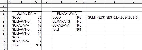 Misalnya untuk menghitung jumlah penumpang bis antar kota dari Detail Data diatas kita bisa menggunakan fungsi SUMIF untuk mendapatkan rekap data jumlah penumpang berdasarkan kota tujuan. Nama kota (sumber data) terletak di cell B4..B10 sedangkan nama kota rekap data terletak di cell E4..E7 sehingga kita gunakan fungsi =SUMIF(B4:B10;E4;C4:C10) untuk menghitung jumlah penumpang yang menuju kota SOLO (cell E4 = SOLO).